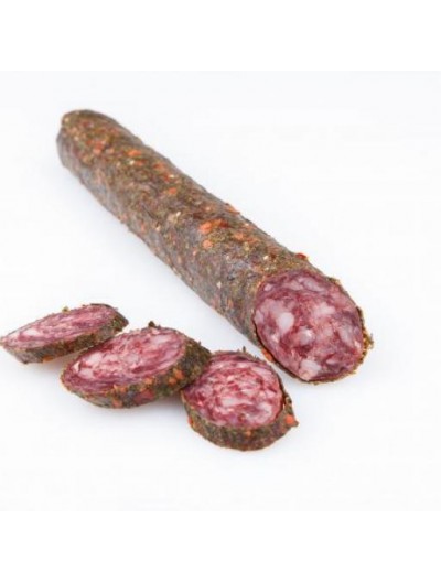 Elaborado con carne de ciervo a la que se añaden magro y panceta de cerdo que le da un suave sabor que marida a la perfección con la intensidad del jabalí. Es de un color rosado, con aroma silvestre y sabor intenso.